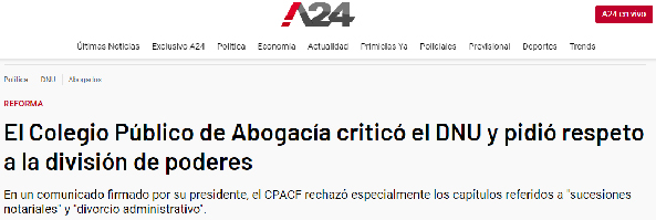 El Colegio Público de Abogacía criticó el DNU y pidió respeto a la división de poderes
