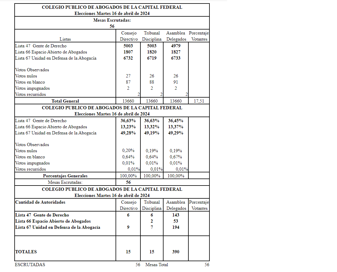 El segundo lugar fue para la lista 47, Gente de Derecho, con el 36,63% de los votos y en tanto la 66 Espacio Abierto de Abogados quedó en tercer lugar con el 13,23% de los sufragios de los matriculados y matriculadas.