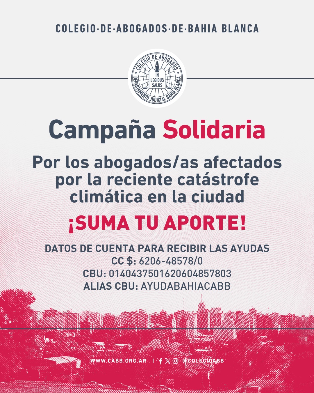 El Colegio de Abogados de Bahía Blanca lanzó una campaña solidaria para asistir a los abogados y abogadas afectados por la reciente catástrofe climática en la ciudad. Desde el CPACF, invitamos a nuestros matriculados y matriculadas a sumarse a esta iniciativa y brindar su apoyo en este difícil momento.
