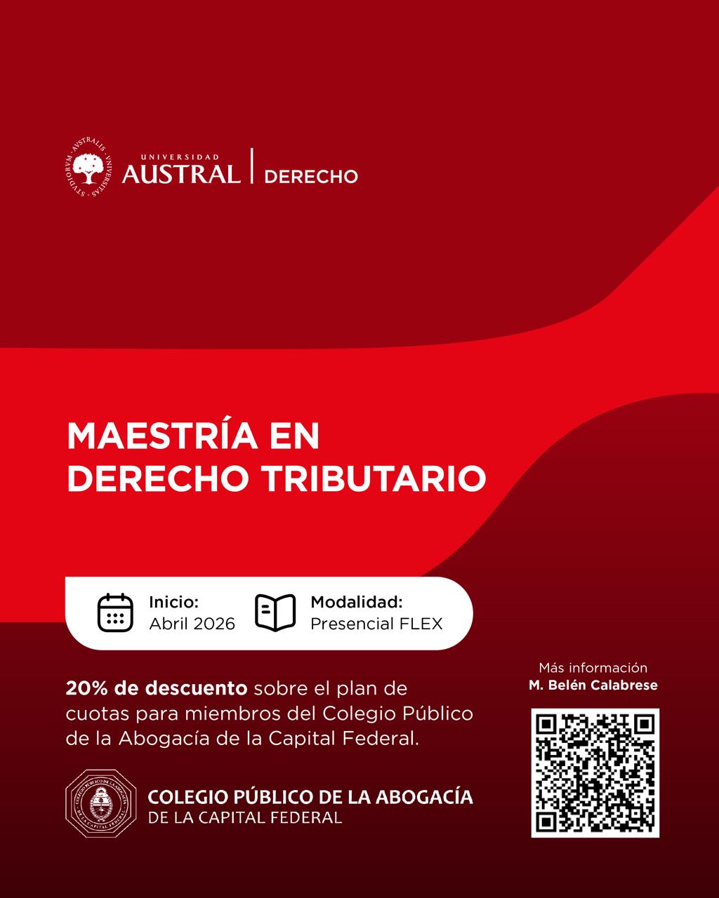 Los matriculados/as del Colegio Público de la Abogacía de la Capital Federal acceden a un 20% de descuento sobre el plan de cuotas en la Maestría en Derecho Tributario de la Universidad Austral.