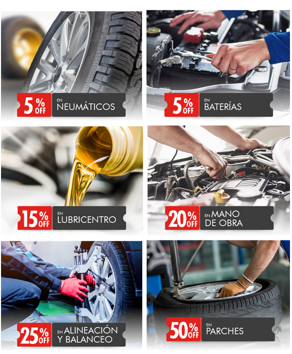 ¿Necesita poner su auto en forma?, acceda a descuentos exclusivos en compra de neumáticos, productos y servicios.