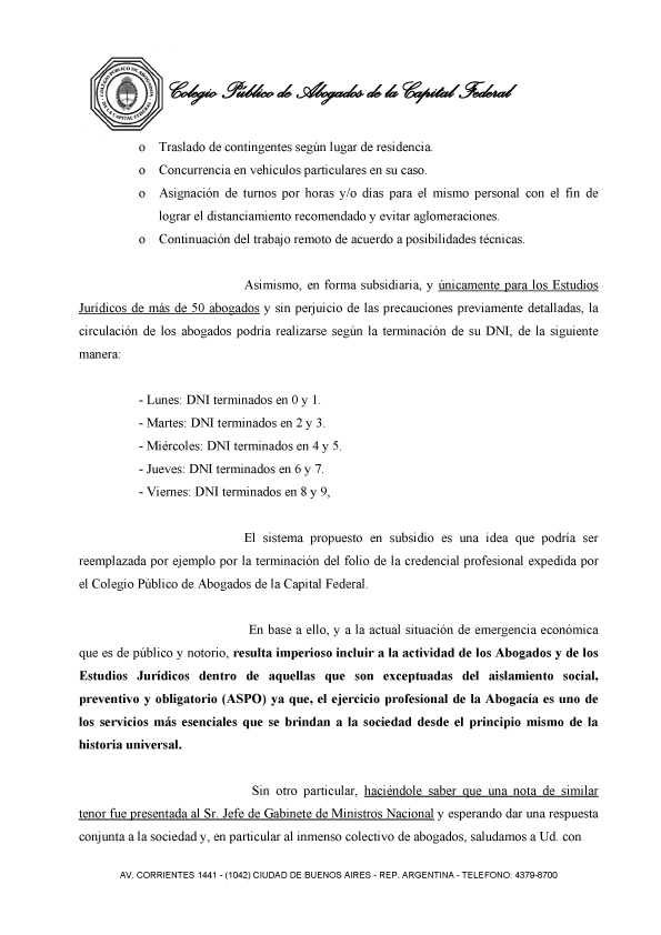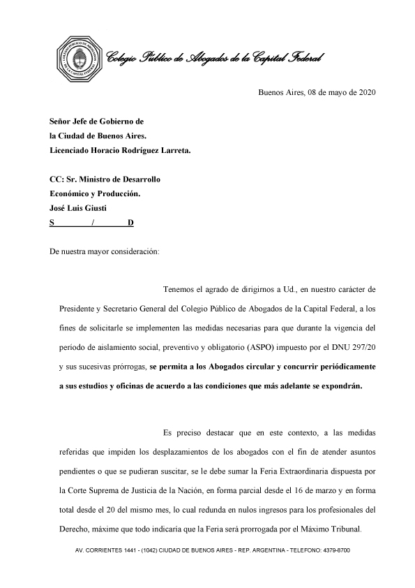 Lo hizo a través de una nota en la que solicitó se implementen las medidas necesarias para que durante la vigencia del período de aislamiento social, preventivo y obligatorio (ASPO), se permita a los Abogados circular y concurrir periódicamente a sus estudios, habilitando la reapertura de éstos.